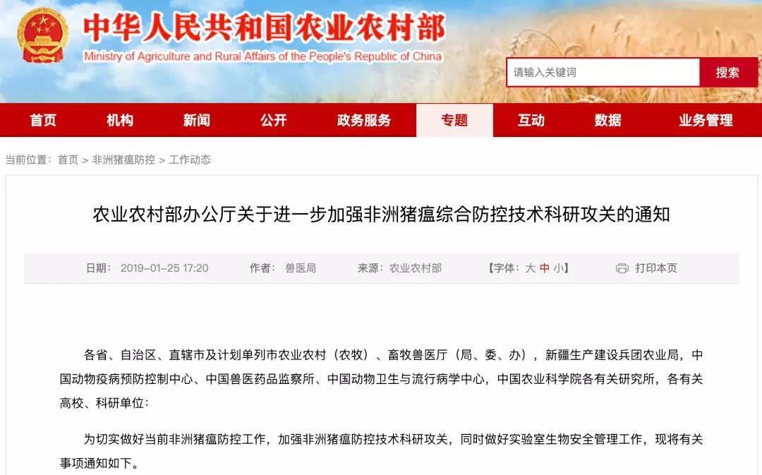 為切實做好當前非洲豬瘟防控工作,加強非洲豬瘟防控技術科研攻關,2019年1月25日,農業農村部辦公廳關于進一步加強非洲豬瘟綜合防控技術科研攻關的通知,通知要求重點推進非洲豬瘟疫苗創制,積極開展技術合作,各級各類農業科研單位要充分利用相關高校、科研院所等單位的技術和硬件條件,聯合開展技術攻關,加快研發進程。